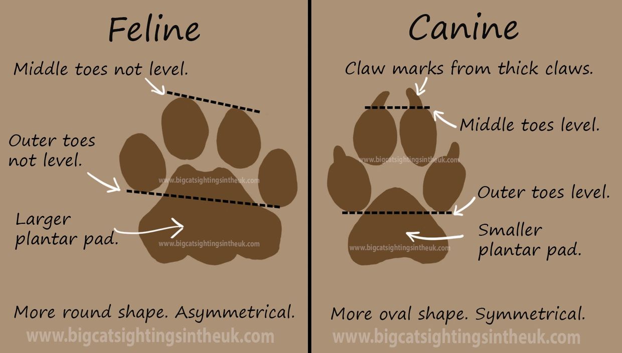 Cats have a ‘leading toe’. This is a toe that is more prominent than the others, it is the 2nd toe – either from the left or right, depending on what the foot is. This toe can tell us if it’s a print from a left or right paw.