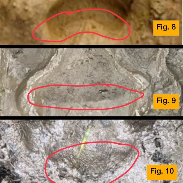 The rear edge has two lobes (Fig 8) but can sometimes appear as a straight edge (Fig. 9) In canines, the plantar pad of the hind feet is more bulbous and can occasionally resemble three lobes (Fig 10). While it generally differs from a feline’s three-lobed pad, it's important to remember that a distorted print can be misleading.