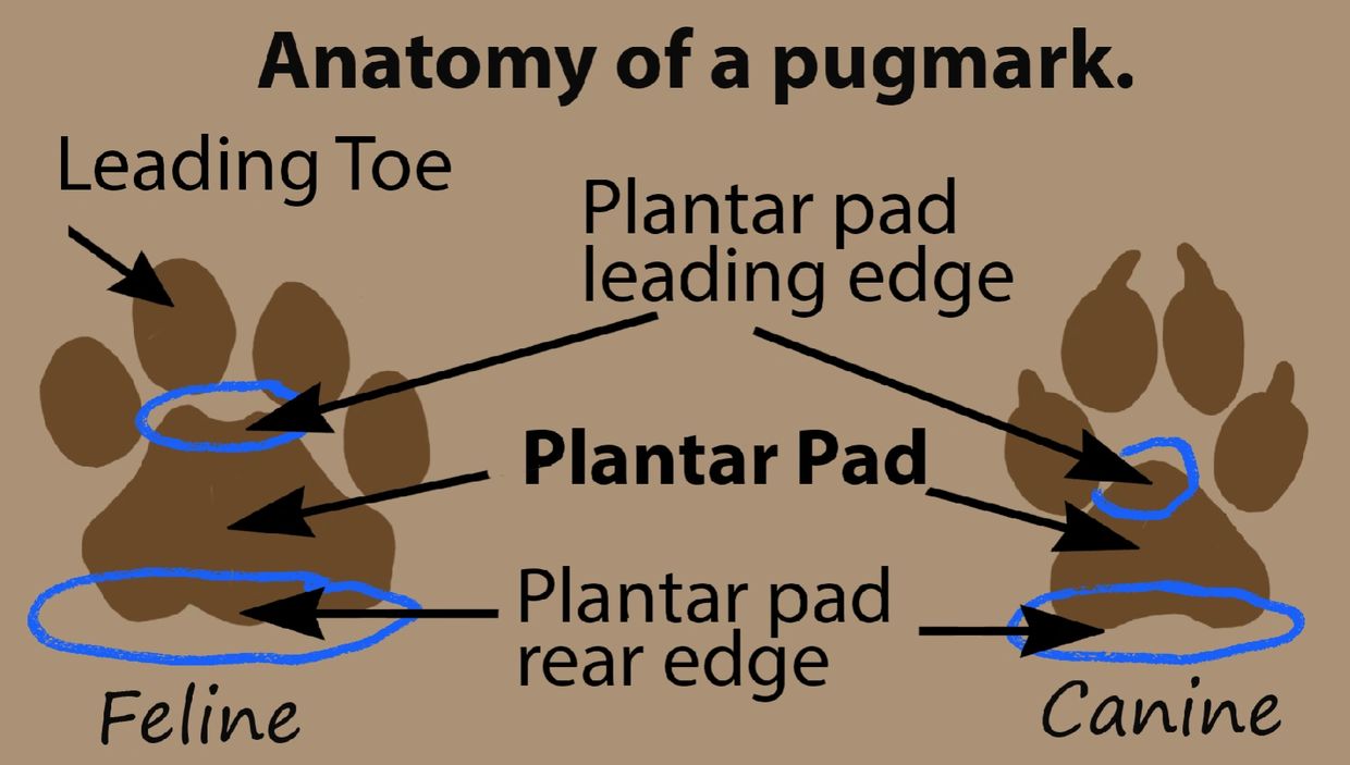 Canine and feline pugmarks share many similar features, that’s why canine pugmarks are often mistaken for big cat pugmarks. They both have four toes, arranged in an arch, around the large, main foot pad (plantar pad). In both species, the rear foot differs slight to the front, it is smaller and narrower, often being more elongated looking than the front foot.